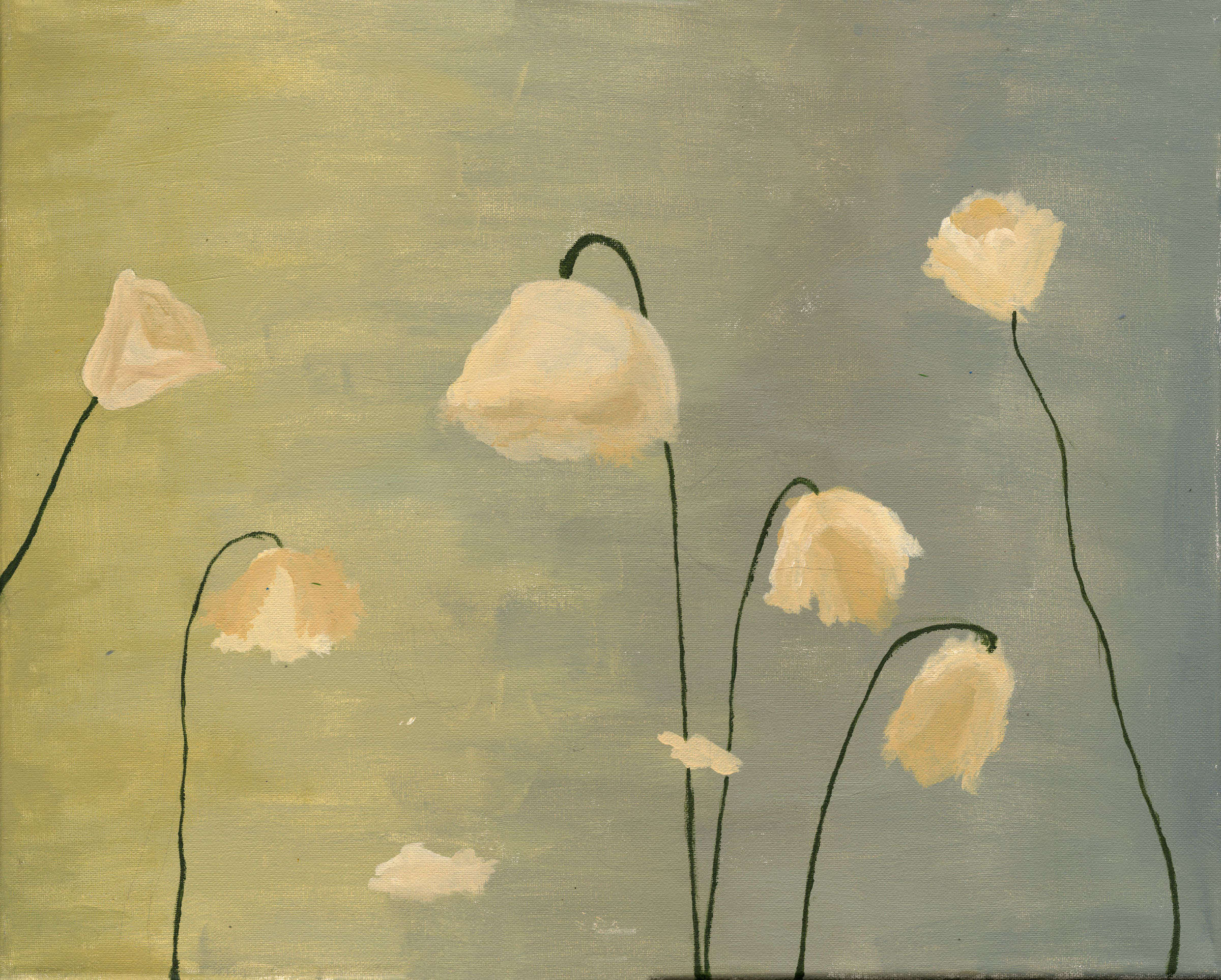 I paint with acrylic because I like to focus on color throughout my pieces. I use color choices to represent the overall mood and aesthetic of each piece. In my piece “peaceful” I chose a blue color palette and soft organic shapes in order to create a calmer feeling for the piece. I also explored the use of embroidery and how that, combined with acrylic paint, can change the message or “feeling” of the piece. Through these choices, I am able to express my various emotions and feelings through the flowers represented in my paintings.