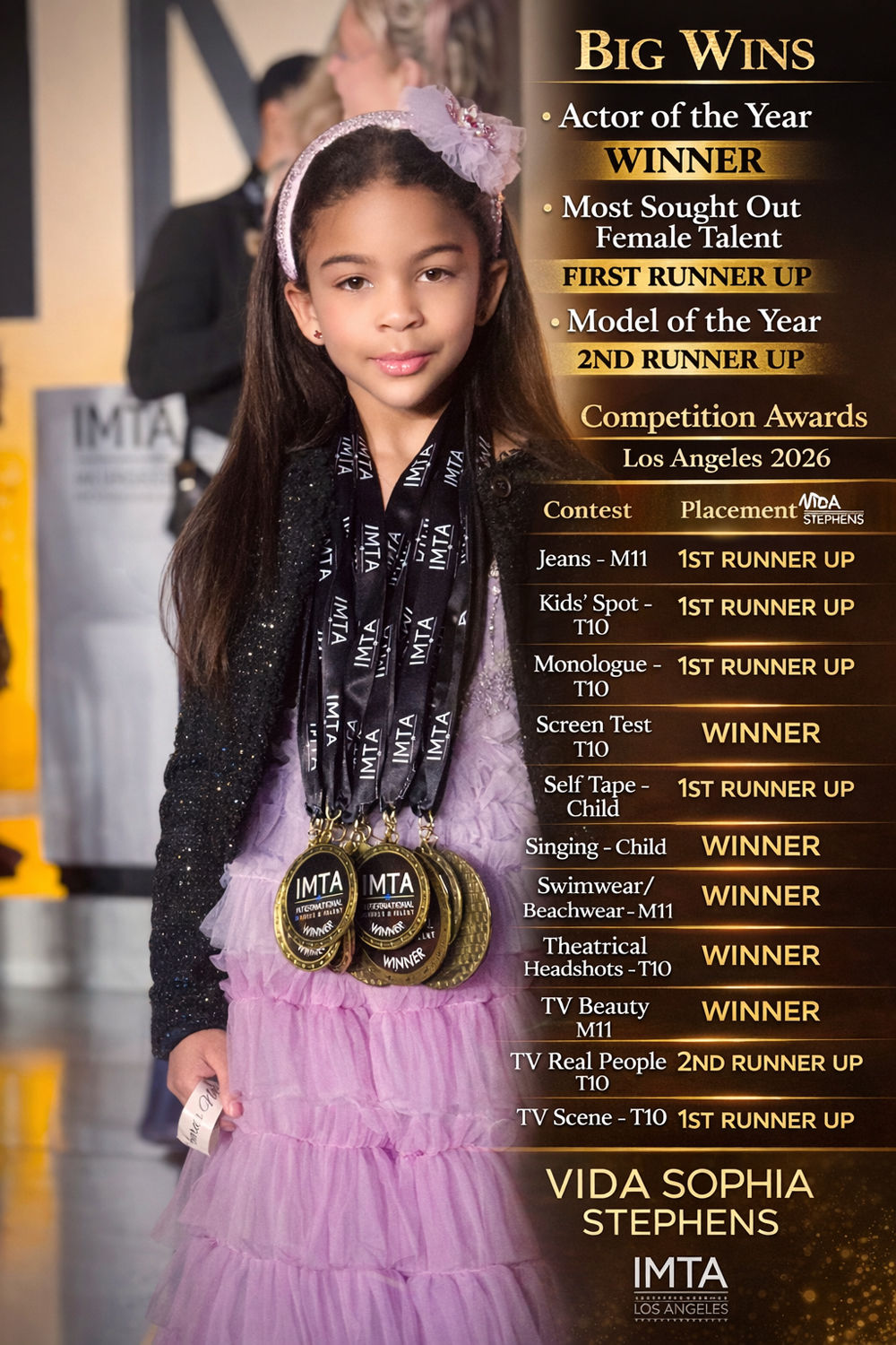 In early January 2026, Lower School student Vida-Sophia S. '36 participated in the 2026 Los Angeles IMTA Convention, walking away with over a dozen awards. Among the accolades, Vida-Sophia's biggest wins included winner in the "Actor of the Year" category, first runner up in the "Most Sought Out Female Talent" category, and second runner up in the "Model of the Year" category.