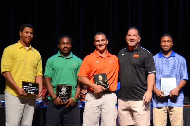 During the 2012-2013 Upper School Athletic Awards Evening on June 3 in the Ceres M. Horn Theatre, student-athletes were recognized for sportsmanship, involvement, leadership, and achievement in interscholastic sports. Senior Elizabeth P. sang The National Anthem to open the program. This year, 33 seniors received Golden Eagle Awards for participating in sports every season of their Upper School careers. Track Coach Alrick Munroe, who is moving away from the Baltimore area, and Athletics Department Administrative Assistant Sharon Bradford, who is retiring after 21 years of service, were honored for their dedication. Also, the first annual Alec Cosgarea Memorial Award was presented. As senior swimmer Hunter G. made his way to the stage as the first recipient, everyone in the theatre stood for an emotional round of applause.