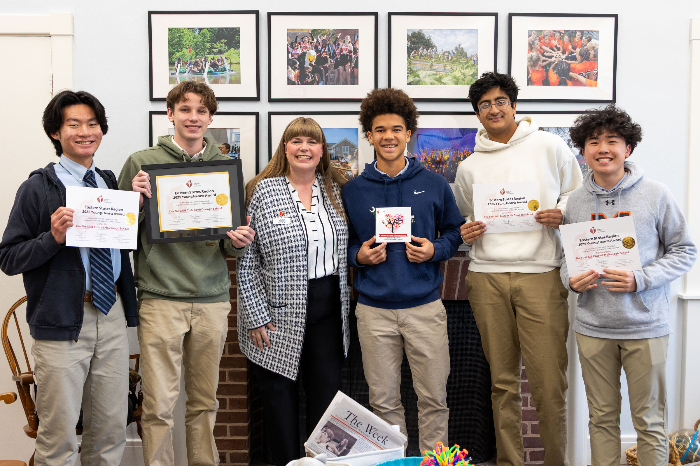 McDonogh's First Aid Club was honored with the American Heart Association’s Eastern States Region Young Hearts Award, which recognizes an exceptional group of student leaders whose dedication to heart health has made a meaningful impact on the community. Kate Poole, Senior Director of School Engagement at the American Heart Association, presented the award on Thursday, November 20.